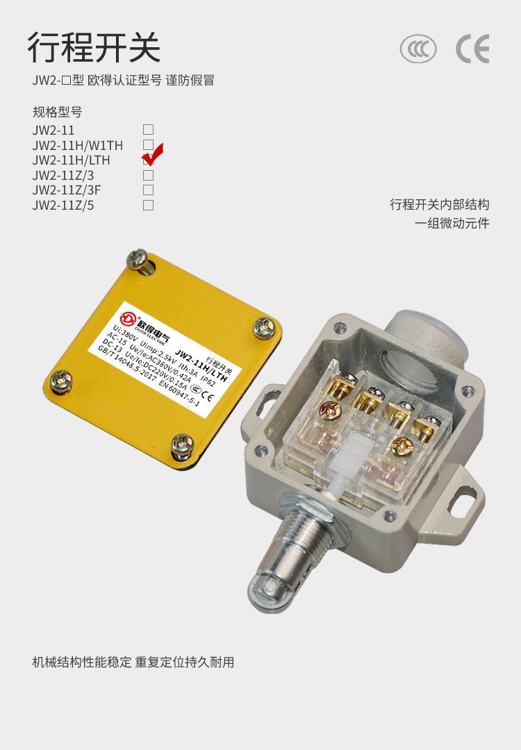 • 行程開關(guān)(JW2-11H/LTH),滾輪柱塞直動式。絕緣電壓380伏,發(fā)熱電流3安培,交流工作電壓380伏、電流0.42安培,直流工作電壓220伏、電流0.15安培,防護(hù)等級IP62。