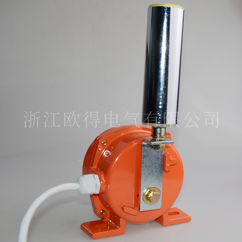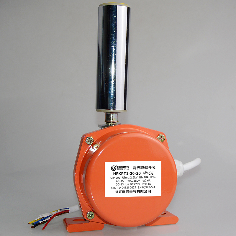 兩級跑偏開關(guān)(HFKPT1-20-30),絕緣電壓400伏,發(fā)熱電流10安培,工作電壓電流交流380伏、2.6安培,直流220伏、0.4安培,防護(hù)等級IP65。主要用于輸送機(jī)膠帶跑偏檢測,防止膠帶跑偏而造成物料溢出等故障。當(dāng)膠帶發(fā)生跑偏時,膠帶邊緣帶動立棍旋轉(zhuǎn)并擠壓立棍使之傾斜。若立棍傾斜大于一級動作角度時,開關(guān)便發(fā)出一組信號用于警告,若立棍傾斜大于二級動作角度時,開關(guān)便發(fā)出另一組信號用于停機(jī)。膠帶機(jī)恢復(fù)正常運(yùn)行后,立棍自動復(fù)位。